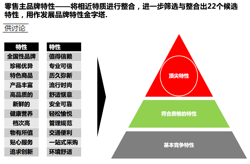 同時,與零售主品牌特性相結合,強化“品牌特質”的篩選,進一步篩選與整合出22個候選特性,用作發展品牌特性金字塔,這些特性與“第一食品”的品牌特性有相通/相近之處,極具參照價值。