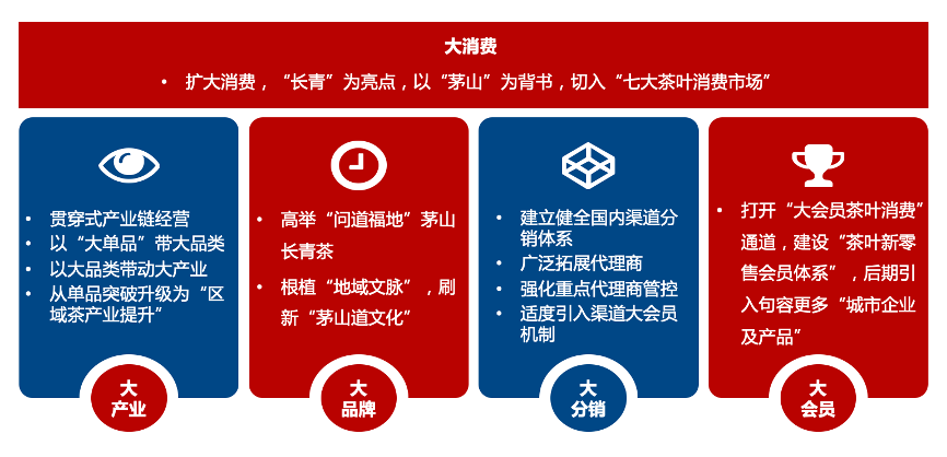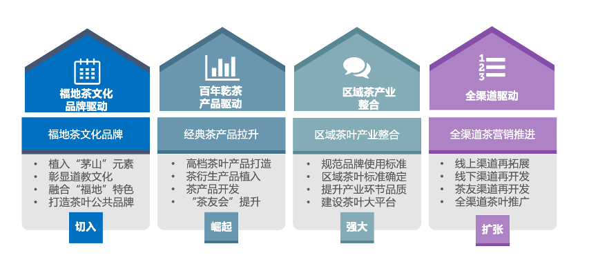 由此,茅山長青茶崛起路線圖在于:“以“福地茶文化”驅動業務增長,快速切入茶市場;以“經典茶產品拉升”,點亮“百年乾茶”,激活產品驅動力;更以“提升產業鏈各環節”,建設茶葉大平臺,推動區域茶葉的“大產業整合”,助力全渠道茶營銷拓展。