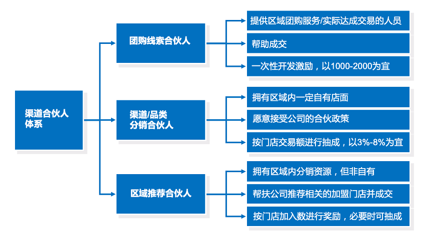 全渠道引流,做活“渠道團購”,助力客戶成交,持續做多“團購線索合伙人”。專注“大單品創造”,激活品類消費能量,持續做強“渠道/品類分銷合伙人”。激活區域分銷資源,讓加盟門店更有活力,讓門店加盟更快,激活區域資源,持續做大“區域推薦合伙人”。三類合伙人,激活區域渠道價值,全力推動區域業績增長。