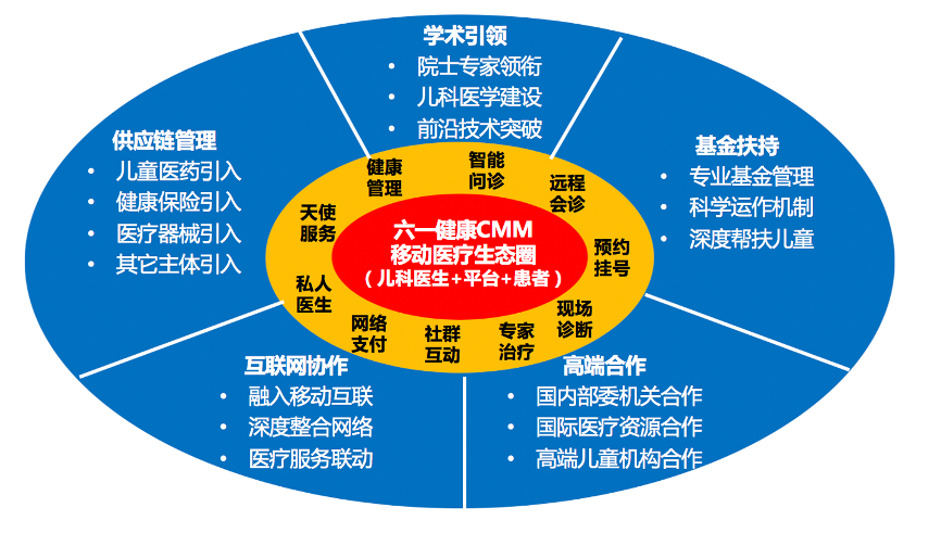六一健康CMM移動醫療生態圈的目標,是打造國際級兒科移動醫療O2O醫聯體,重點發力兒科智能問診、遠程會診、預約輿論、現場診斷、專家治療、社群互動、網絡支付等兒科診療價值,強化私人醫生、天使服務和健康管理等兒科診斷服務,并構筑兒科診斷學術引領、醫療基金扶持、高端醫療合作、互聯網協作及兒科醫療供應鏈管理等兒科醫療生態圈。