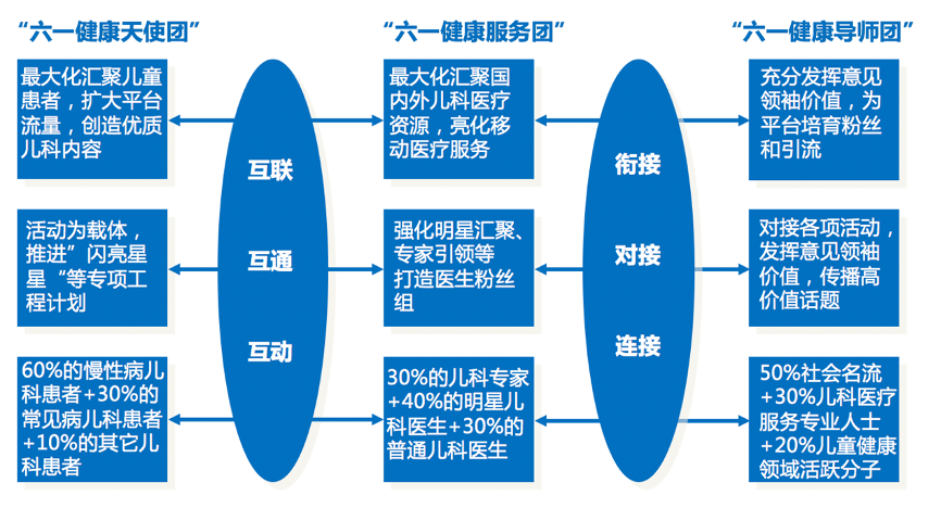 “三大頂級醫療服務團”打造之“六一健康服務團”:最大化匯聚國內外兒科醫療資料,強化明星匯聚、專家引領等,打造醫生粉絲團,由“30%的兒科專家+40%的明星兒科醫生+30%的普通兒科醫生”組成。