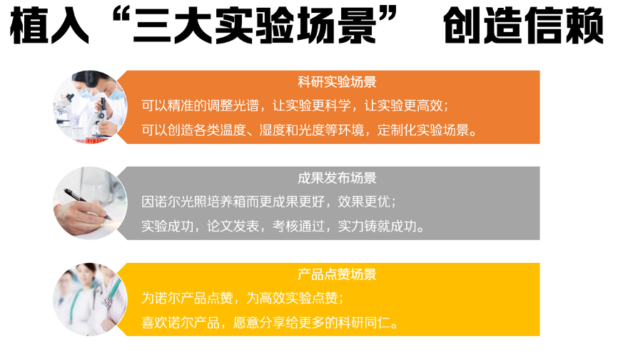 以“科研場景”為主打,以“精準的光譜調節”切入,提供更準確的數據,點亮“諾爾”光照培養箱的新常態。以“成果發布場景”為形象,全面點亮“實驗室成果”,全面點亮“實驗項目”,放大實驗成功、論文發表、考核通過等新價值。以“產品點贊場景”為傳播重點,讓實驗室客戶為諾爾產品點贊,鼓勵用戶積極分享諾爾產品,全面提升公司的產品口碑。