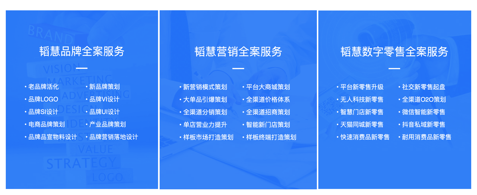 “三大區(qū)別”之三:“全渠道新零售經(jīng)營(yíng)”。韜慧咨詢立足于“全渠道”品牌營(yíng)銷策劃,不但提供線下渠道經(jīng)營(yíng)及品牌推廣,而且提供線上電商經(jīng)營(yíng)、社交電商經(jīng)營(yíng)、社交新零售經(jīng)營(yíng)、無人零售、AI經(jīng)營(yíng)等線上經(jīng)營(yíng)策劃,同時(shí)提供品牌全案策劃、營(yíng)銷全案策劃、全渠道新零售全案策劃“三大全案策劃服務(wù)”。