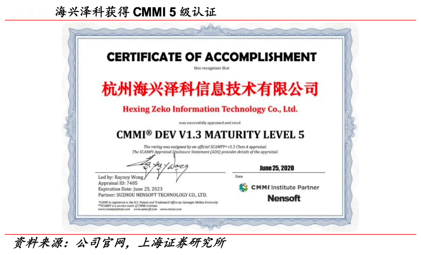 經典案例:根據公司官網、上海證券研究所等綜合資訊表明,海興電力公司全資子公司海興澤科信息技術有限公司,已獲得國家重點軟件企業認定,獲得全球最高等級 CMMI 5 級認證,是行業內極少數可面向全球市場提供高質量軟件 集成服務的企業。