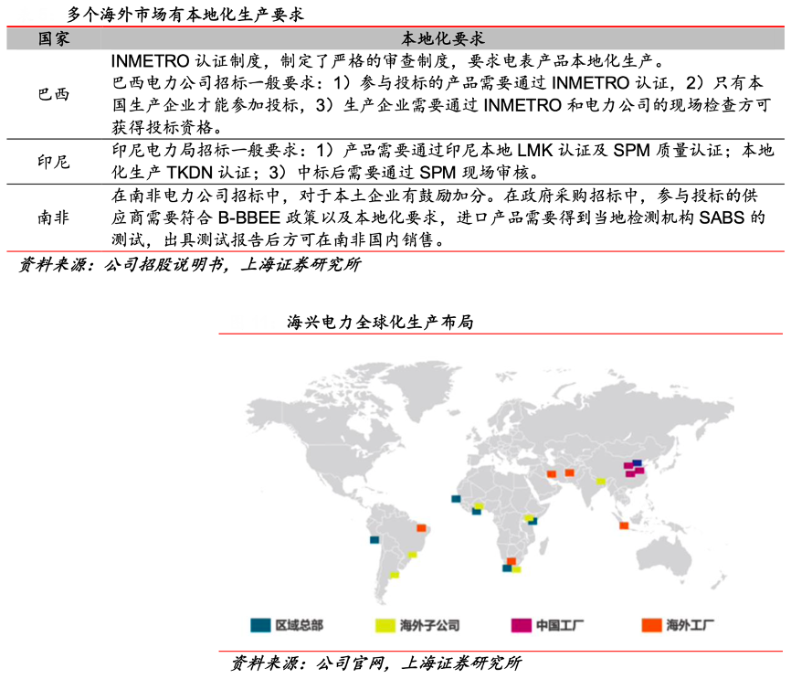經典案例:根據公司招股說明書、公司官網、上海證券研究所等綜合資訊表明,從貿易壁壘的設置來看,各地有很強的傾向鼓勵本地化生產,如巴西和印尼直接要求本地化生產,海興電力公司在海外市場深耕多 年,在全球范圍內擁有多個工廠、子公司、辦事處,具備豐富的全球化管理和運營經驗,短期內競爭對手難以復制。
