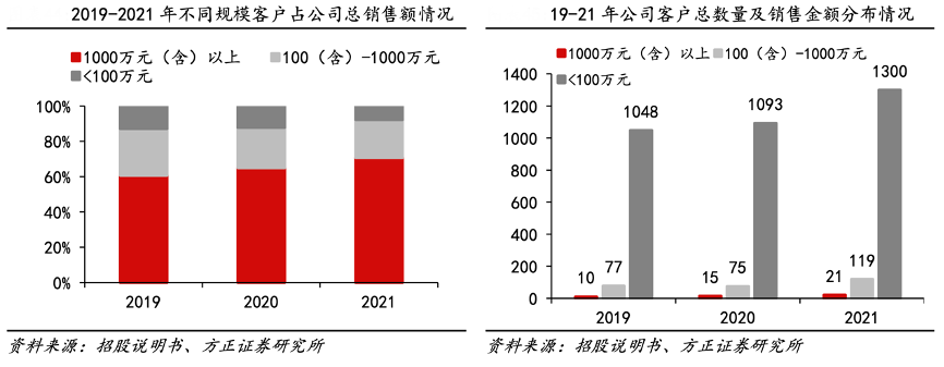 經(jīng)典案例:根據(jù)招股說明書、方正證券研究所等綜合資訊表明,從寶立食品客戶擴展數(shù)量來看,其大客戶(年銷售額 1000 萬元及以上)年均拓展 5.5 家,大客戶數(shù)量呈逐年上升趨勢,主要系公司基于對大客戶的服務(wù)能力及行業(yè)口碑,不斷拓展優(yōu)質(zhì)客戶的結(jié)果。該部分客戶銷售金額合計占公司主營業(yè)務(wù)收入的比例較高,各期均超過60%,集中度較高。