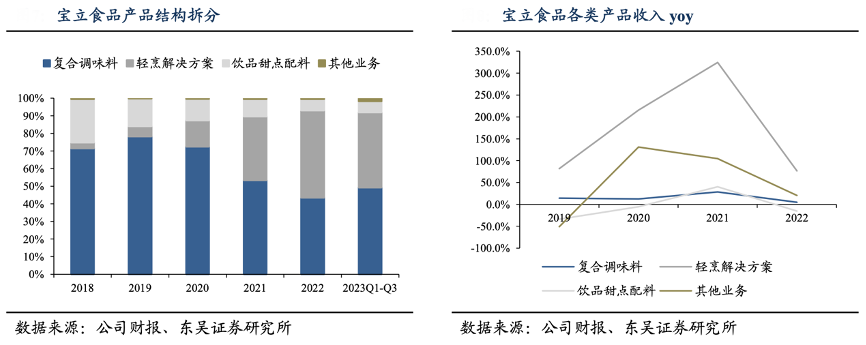 經典案例:根據公司財報、東吳證券研究所等綜合資訊表明,寶立公司主營業務分為復調、輕烹解決方案和飲品甜點配料。2021 年公司收購廚房阿芬 75%股份后,空刻意面業務并入輕烹解決方案收入。復調和輕烹業務現在系公司收入兩大基石,2023Q1-3 復調、輕烹業務收入占比分別為 49%/43%。