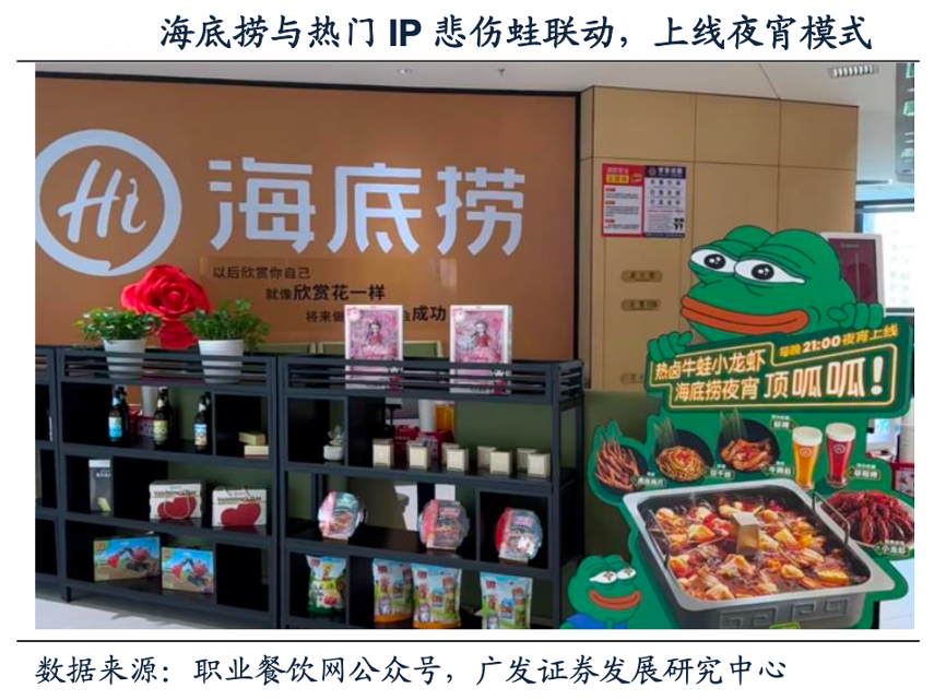 經典案例:根據職業餐飲網公眾號、廣發證券發展研究中心等綜合資訊表明,2023年暑期海底撈近1000家門店 每晚上線夜宵,增加小龍蝦、鹵味、牛蛙鍋、精釀啤酒等產品,聯動熱門IP悲傷蛙,每晚定時發起猜拳活動。