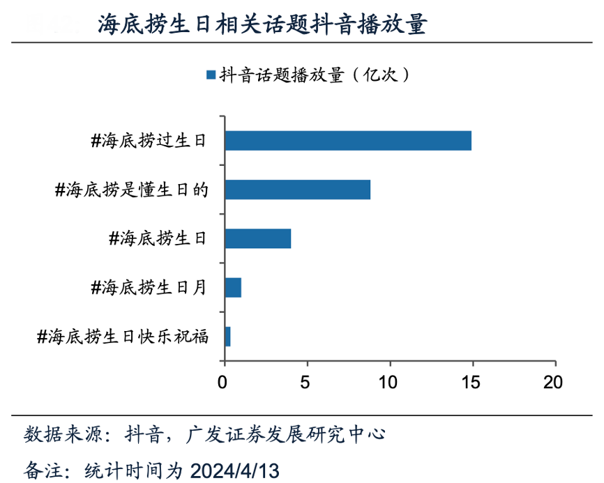 經典案例:根據抖音、廣發證券發展研究中心等綜合資訊表明,在海底撈過生日已成為別具特色的消費符號,在各社交平臺上具有較高熱度,屢屢出圈。截至2024年4月13日,抖音“海底撈過生日”話題播放量達14.9億次,“海底撈是懂生日的”話題播放量達8.8億次。