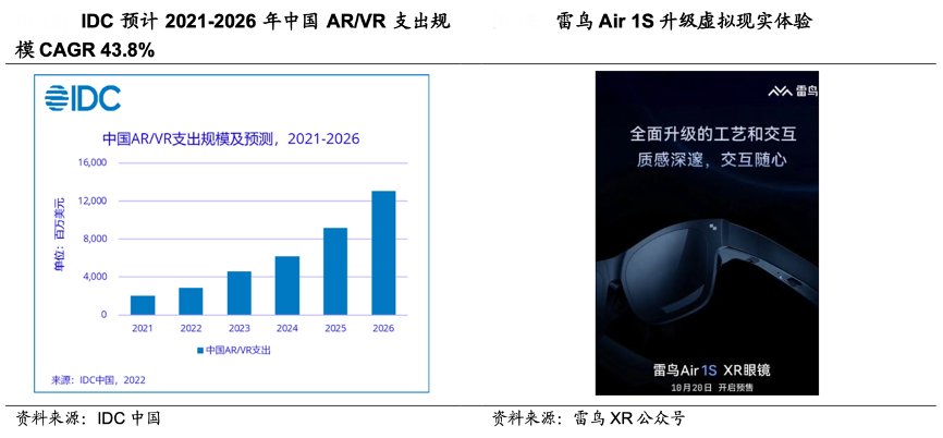 經(jīng)典案例:根據(jù)IDC中國、雷鳥XR公眾號、國海證券研究所等綜合資訊表明,從 AR 眼鏡到 VR 一體機再到 XR 視頻直播平臺建設(shè),黑電企業(yè)積累底層技術(shù)支持元宇宙形態(tài)。TCL 電子孵化雷鳥創(chuàng)新專注 AR 領(lǐng)域,2022 年 4 月雷鳥上市定位于消費級娛樂大屏智能眼鏡產(chǎn)品雷鳥Air,后與元宇宙工具平臺 720 云達成戰(zhàn)略合作,圍繞 XR 內(nèi)容生態(tài)建設(shè)展開合作,10月發(fā)布雷鳥 Air 眼鏡的升級版 Air 1S。2022年“雙 11”期間雷鳥 AR 眼鏡在天貓+京東雙平臺 AR 品類總銷量/總銷額雙第一, 銷售額環(huán)比 618 全周期提升484%。