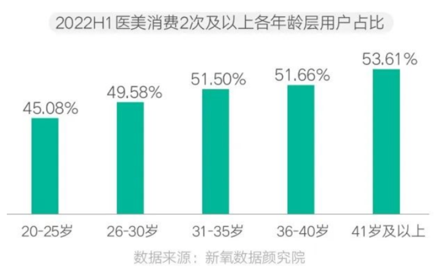 典型現(xiàn)象:根據(jù)新氧數(shù)據(jù)顏究院等綜合資訊表明,用戶每年的醫(yī)美消費頻次,歷來是檢驗醫(yī)美用戶信任度、忠誠度的關(guān)鍵數(shù)據(jù)。分年齡層來看,20-25歲的用戶中,2022年 H1 醫(yī)美消費 2 次及 2 次以上的用戶占比達(dá) 46.08%,26-30 歲年齡區(qū)間的用戶占比 49.58%,相比之下,31-35 歲的醫(yī)美用戶中,有 51.5%的用戶消費 2 次及 2 次以上,41 歲及以上用戶的占比更是高達(dá) 53.61%。