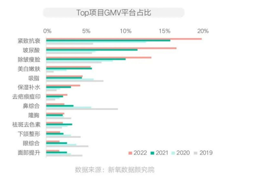 典型現(xiàn)象:根據(jù)新氧數(shù)據(jù)顏究院等綜合資訊表明,2022 年新氧 TOP10 項目 GMV 合計平臺占比高達(dá) 80%,說明消費者選擇醫(yī)美項目呈現(xiàn)顯著集中趨勢,緊致抗衰、玻尿酸、除皺瘦臉進(jìn)入消費者?選的醫(yī)美項目前 3 名。
