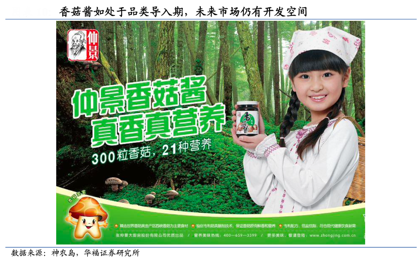 經典案例:根據神農島、華福證券研究所等綜合資訊表明,隨著消費者健康意識覺醒、消費代際更迭以及便 捷性需求的提升,香菇醬在全國仍具備滲透一定滲透空間。而且仲景食品是國內首家研發出發酵型香菇醬、并成功實現市場化的公司,先發優勢顯著;且根據全國連鎖店超市信息網的統計,2018 年仲景香菇醬在全國醬類的市場占有率為3.15%。