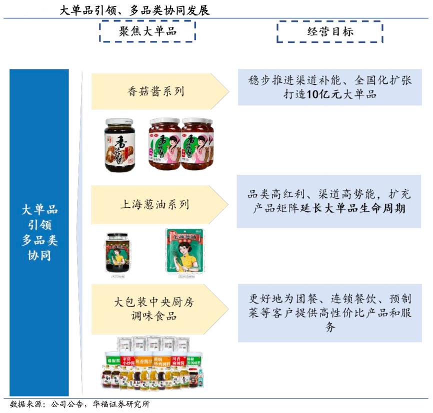 經典案例:根據公司公告、華福證券研究所等綜合資訊表明,仲景食品公司踐行大單品引領、多品類協同發展的產品戰略,其中公司第一單品香菇醬仍具備區域拓展、渠道填補的空間,目標 10 億,而公司階段性快增預期基于上海蔥 油持續放量以及對線上渠道紅利的攫取,調配業務跟隨大 B 擴張同時固老開新,未來保持穩健增長態勢。