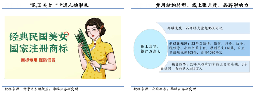 經典案例:根據公司公告、仲景京東旗艦店、華福證券研究所等綜合資訊表明,仲景食品公司繼續深化“采蘑菇的小姑娘”、“民國美女”的品牌形象,以高品牌辨識度區隔其他白牌及模仿型競爭對手,通過持續的投流引流實現線上渠道的放量與霸榜,截止 23 年末公司擁有 31 家 線上自營店鋪,3 個直播間,合作達人超 4 萬人,已形成覆蓋貨架電商、興趣電商和到店到家的銷售矩陣。