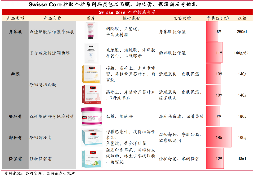 經(jīng)典案例:根據(jù)公司官網(wǎng)、國聯(lián)證券研究所等綜合資訊表明,Swisse Core公司在保健品領(lǐng)域深耕多年,原料、配方技術(shù)優(yōu)勢顯著,疊加“自然、健康”的品牌調(diào)性,有望為其個護領(lǐng)域的布局奠基。公司個護領(lǐng)域布局涵蓋身體乳、面膜、磨砂膏、卸妝膏及保濕霜等品類,功效上強調(diào)溫和舒緩,敏感肌適配性強。