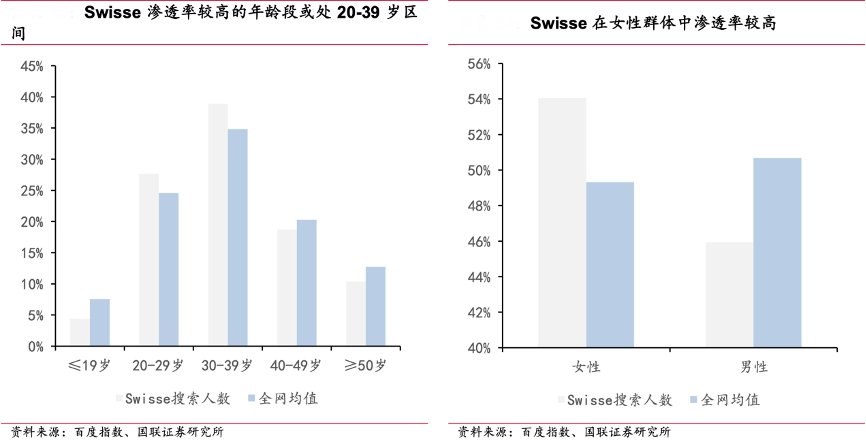 經(jīng)典案例:根據(jù)百度指數(shù)、國聯(lián)證券研究所等綜合資訊表明,Swisse主要客群畫像或為 20-39 歲區(qū)間女性消費者,口服美容系列貼近主要客群需 求,產(chǎn)品定位上更細分,如鎖水補水的“水光瓶”、打造輪廓線的“超光瓶等,終端表現(xiàn) 較為突出,23Q4 上市的超光瓶在 2023 年雙十一期間 GMV 高達 776 萬,超光瓶、膠原水光瓶銷量位居全平臺第一。