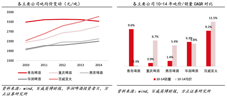 經(jīng)典案例:根據(jù)wind、百威英博財報、華潤啤酒投資者日、方正證券研究所等綜合資訊表明,百威亞太具備高端化戰(zhàn)略遠見,采取高舉高打的營銷策略:通過舉辦全渠道營銷活動、跨界聯(lián)名、贊助賽事等方式建設(shè)百威品牌的高端形象,不打價格戰(zhàn)。百威中國區(qū)噸收入 10-14 年 CAGR 達 11.5%,高于同行業(yè)主要公司。百威英博亞太區(qū)域 2015 年的銷售費用率(不含運費)達 25.18%,高于啤酒行業(yè)其他公司。