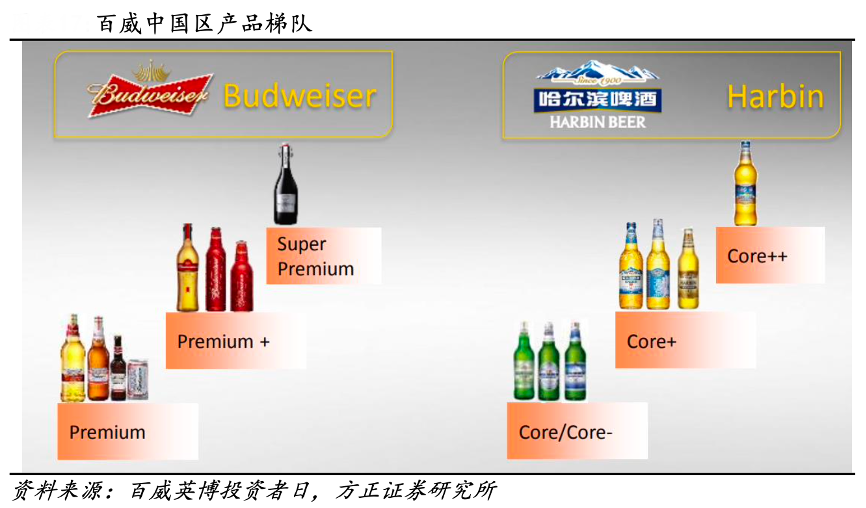 經(jīng)典案例:根據(jù)百威英博投資者日、方正證券研究所等綜合資訊表明,百威亞太“升級包裝+推出創(chuàng)新性產(chǎn)品”推動高端化,公司通過推動哈爾濱冰純(2006 年推出)在哈爾濱啤酒家族(清爽、冰暢、冰爽定位核心價格帶)中占比提升來推動核心到核心+價格帶的升級。公司 12H1 到 15H1 整體均價提升 CAGR +9%,90%由產(chǎn)品結(jié)構(gòu)變動貢獻;10%由提價貢獻。