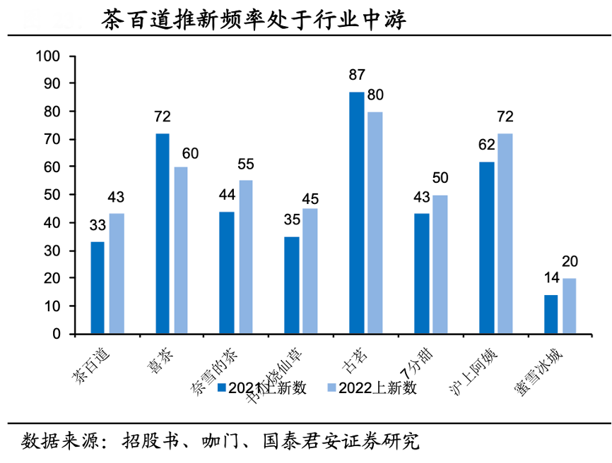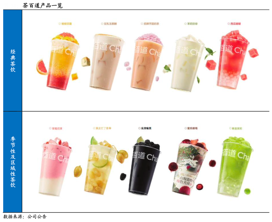 經(jīng)典案例:根據(jù)招股書、咖門、國泰君安證券研究等綜合資訊表明,茶百道公司持續(xù) 對消費者口味喜好的變化趨勢進行調(diào)研與預判,通常每隔幾個月即上新季節(jié)限定款或區(qū)域限定款產(chǎn)品的方式持續(xù)為消費者帶來新穎、驚喜的茶飲體驗。2023 年,茶百道開發(fā)出約 250 多款產(chǎn)品,并推出了 48 款新品,升級了 13 款產(chǎn)品,飽受消費者好評。