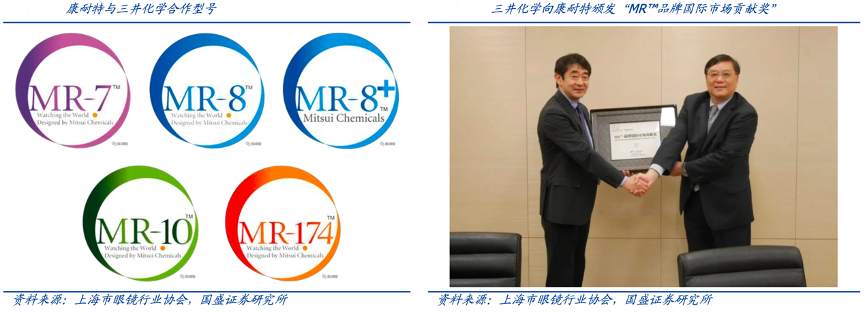 經典案例:根據上海市眼鏡行業協會、國盛證券研究所等綜合資訊表明,MRTM系列材料方面,康耐特是日本三井化學最重要的戰略合作伙伴之一。三井化學曾向康耐特頒發“MRTM品牌國際市場貢獻獎”,康耐特憑借其在 MRTM產品推廣方面的積極貢獻,獲得鏡片原料領域全球龍頭三井化學的高度認可。
