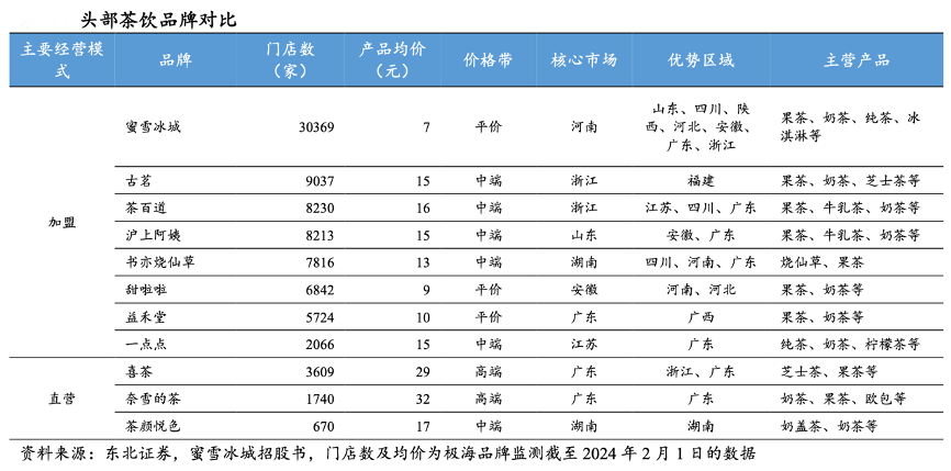 經典案例:根據東北證券、蜜雪冰城招股書、極海品牌監測數據等綜合資訊表明,蜜雪冰城是平價市場的絕對龍頭,根據窄門餐眼數據,截至到 2024 年 2 月 1 日,蜜雪冰城門店數約 3 萬家,遠超現制茶飲其他品牌,而產品均價 7 元,在現制茶飲行業價格優勢顯著。