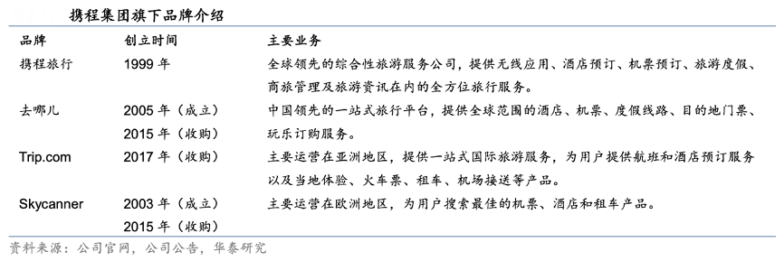 經典案例:根據公司官網、公司公告、華泰研究等綜合資訊表明,攜程集團(Trip.com Group)成立于 1999 年,其主要業務包括住宿預定、交通票務、旅游度假以及商旅管理,2003 年在納斯達克上市并于 2021 年 在香港聯交所上市,是全球領先的一站式 OTA 平臺。