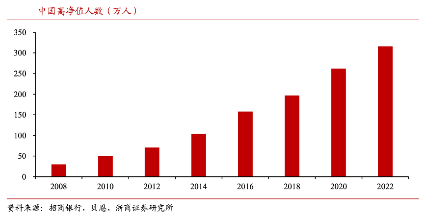 經典案例:根據招商銀行、貝恩、浙商證券研究所等綜合資訊表明,2022 年中國可投資資產在 1,000 萬人民幣以上的高凈值人群數量達 316 萬人,并且客群進一步年輕化,2023 年 40 歲以下的群體占比達 49%,相較于 2021 年的 42%上升了 7pp。老 鋪截至 2023 年底忠誠會員人數達到 20.3 萬人,在高凈值人群的滲透率為 6.4%。