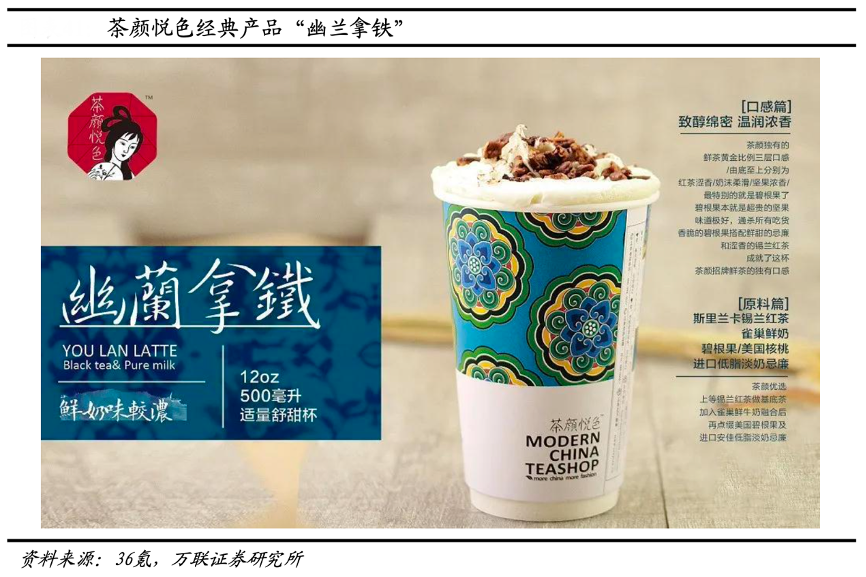 經典案例:根據36氪、萬聯證券研究所等綜合資訊表明,茶顏悅色產品售價位于茶飲行業中等水平,但其 產品選用食材新鮮,且食材大多采用進口原料,例如錫蘭紅茶、雀巢鮮奶、美國核桃等,打造高性價比,深受消費者喜愛。