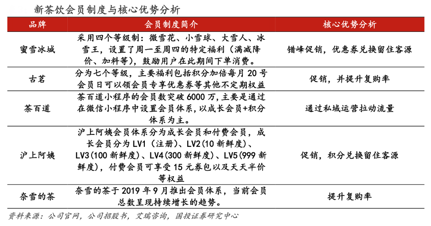 經典案例:根據公司官網、公司招股書、艾瑞咨詢、國投證券研究中心等綜合資訊表明,五家茶飲企業均采用會員制的方式進行客戶留存,以提升新客轉化率。會員制的核心目在于,通過積分的方式推進復購率的提升,推動老客群體的多次消費;同時以會員制形成一個較好的渠道,從而使得新茶飲企業利用新媒體進行更多的私域流量引流。