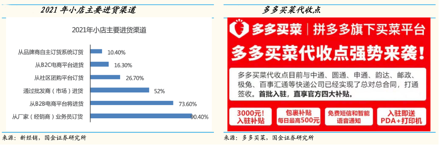 經典案例:根據新經銷、多多買菜、國金證券研究所等綜合資訊表明,2021 年 1 月,多多買菜批發業務立項,4 月已在東北三省、福建、江浙、廣西等地上線批發業務。以廣東為例,多多買菜廣佛地區的大件貨 SKU 已超300,且日單量已超 7 萬,約占中心倉單量的五分之一。批發業務與社區團購的布局形成協同效應,提升訂單密度,降低履約成本。