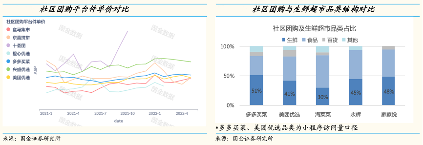 經典案例:根據國金證券研究所等綜合資訊表明,2020年8月拼多多公司推出多多買菜業務,截至目前多多買菜市場份額達到42%,龍頭優勢明顯。公司傳統優勢品類-生鮮農產品(果蔬肉蛋)是主要的銷售來源。從多多買菜小程序的品 類訪問結構來看,蔬菜/水果/肉蛋占比近一半。生鮮平均單價低于標品及百貨,預計低毛利的生鮮品類占比低于50%。