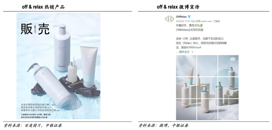 經(jīng)典案例:根據(jù)百度圖片、微博、中銀證券等綜合資訊表明,2021年 6 月 28 日公司通過(guò)溫泉水頭皮護(hù)理品牌off&relax 布局內(nèi)地高端洗護(hù)類產(chǎn)品。off&relax為頂級(jí)研發(fā)工程師楊建中與珀萊雅合作共創(chuàng):楊建中深耕頭皮洗護(hù)領(lǐng)域 26 年,在全球擁有 50 多項(xiàng)專利,主要負(fù)責(zé)產(chǎn)品的產(chǎn)線,而珀萊雅負(fù)責(zé)中國(guó)市場(chǎng)的運(yùn)營(yíng),截至目前已有 7 款SKU。