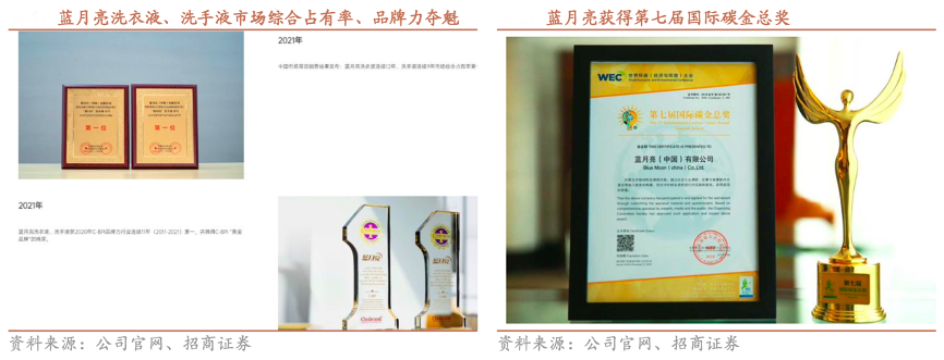 經(jīng)典案例:根據(jù)公司官網(wǎng)、招商證券等綜合資訊表明,結(jié)合中國商業(yè)聯(lián) 合會、中華全國商業(yè)信息中心統(tǒng)計數(shù)據(jù),藍月亮洗衣液連續(xù) 12 年(2009-2020)、洗手液連續(xù) 9 年(2012-2020)行 業(yè)市場綜合占有率第一,在 Chnbrand 發(fā)布的中國品牌力指數(shù)品牌排名中,藍月亮洗衣液、洗手液品牌力指數(shù)連續(xù) 11 年(2011-2021)第一。其堅持可持續(xù)發(fā)展理念,在國內(nèi)外屢獲環(huán)境保護、社會公益獎項。