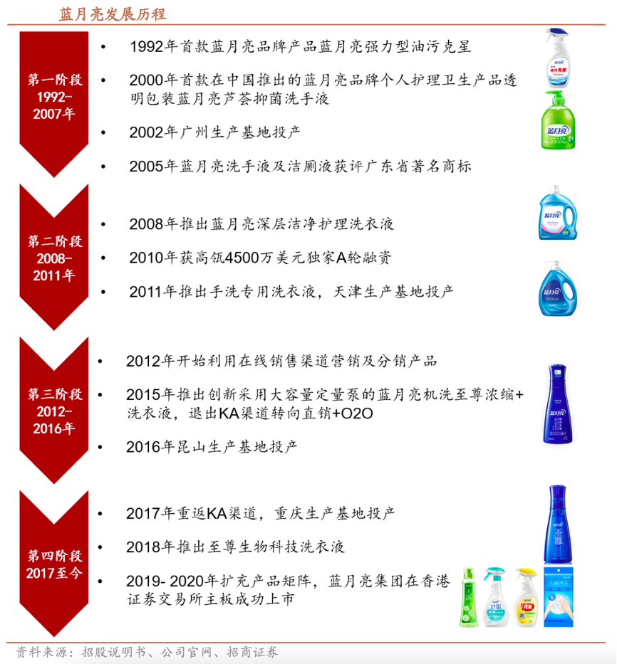 經(jīng)典案例:根據(jù)招股說明書、公司官網(wǎng)、招商證券等綜合資訊表明,藍月亮于2008年在全國率先推廣洗衣液,改變十余億中國人的洗衣習慣,推動洗衣粉轉(zhuǎn)向洗衣液的跨越式升級;于2011年推出藍月亮手 洗專用洗衣液,倡導專品專用清潔理念;于2015年推出藍月亮機洗至尊濃縮+洗衣液,在國內(nèi)屬采用濃縮技術(shù)的第一梯隊,再次推動中國洗滌行業(yè)市場變革,由普通型洗衣液跨越升級為濃縮型洗衣液。
