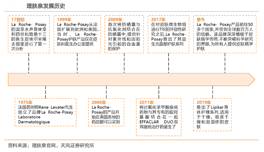 經典案例:根據理膚泉官網、天風證券研究所等綜合資訊表明,理膚泉于 1975 年由法藥劑 師創立,后于 1999 年擴展至歐洲和美國。初期理膚泉僅由皮膚科醫生辦公室提供,隨后逐步覆蓋美國各地藥房。2009年首次推出防曬霜,并在之后陸續推出雙效痤瘡治療藥,益生元面部護膚系列和身體護理系列。目前該品牌已經受到全球五十多個國家、數百萬人的信賴。