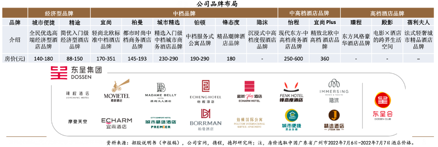 經典案例:根據招股說明書、公司官網、攜程、德邦研究所等綜合資訊表明,東呈酒店聚焦大眾出行住宿市場,為大眾出行者提供高性價比住宿體驗,目前已累計開發 13 個自主品牌、接近 30 項酒店產品,已形成覆蓋經濟型(2個)、中檔(6個)、中高檔(2個)和高檔(3個)的酒店品牌體系,其中檔酒店定價相對更低,也與全季等其他酒店集團中端產品形成差異化競爭。