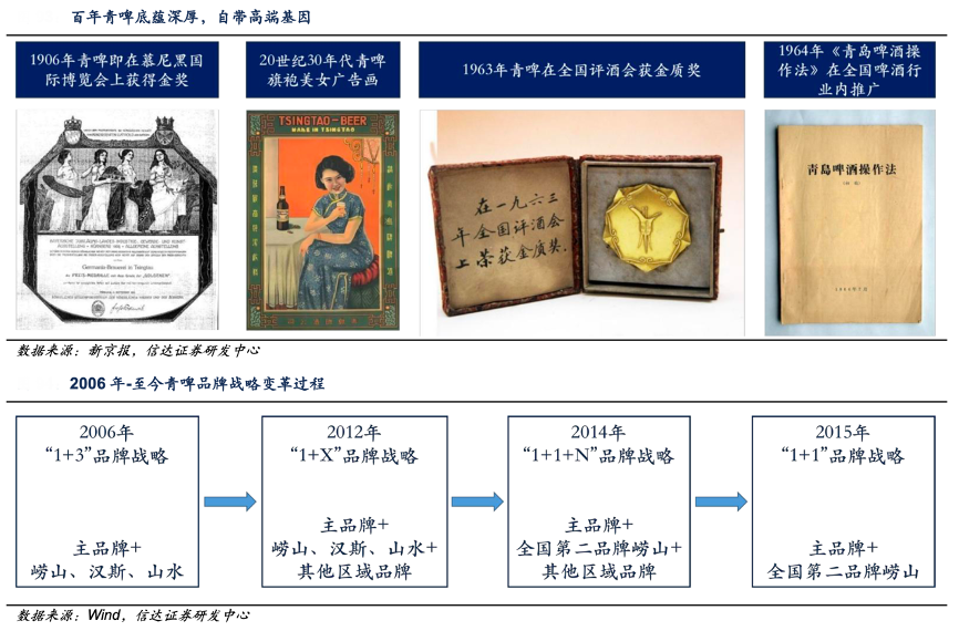 經典案例:根據新京報、wind、信達證券研發中心等綜合資訊表明,青啤的品牌戰略歷經從多品牌到雙品牌、從多元到聚焦的變革過程。公司以“青島啤酒主品牌+嶗山副品牌”的“1+1”品牌戰略運營產品,分層管理旗下品牌,其中主品牌定位中高端市場,嶗山定位大眾消費市場。