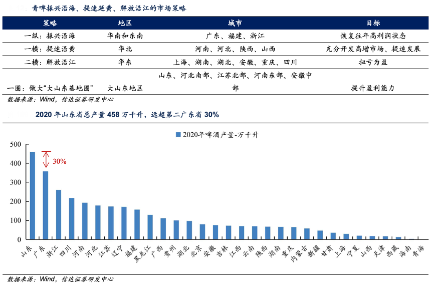 經典案例:根據wind、信達證券研發中心等綜合資訊表明,2018年,青島啤酒公司新管理層進一步調整區域市場策略,布局“一縱兩橫”,并提出振興沿海、提速延黃、解放沿江的策略,要求在提升山東市場盈利能力的同時,力爭把華東華南市場打造成新的利潤池,向內陸區域擴張。