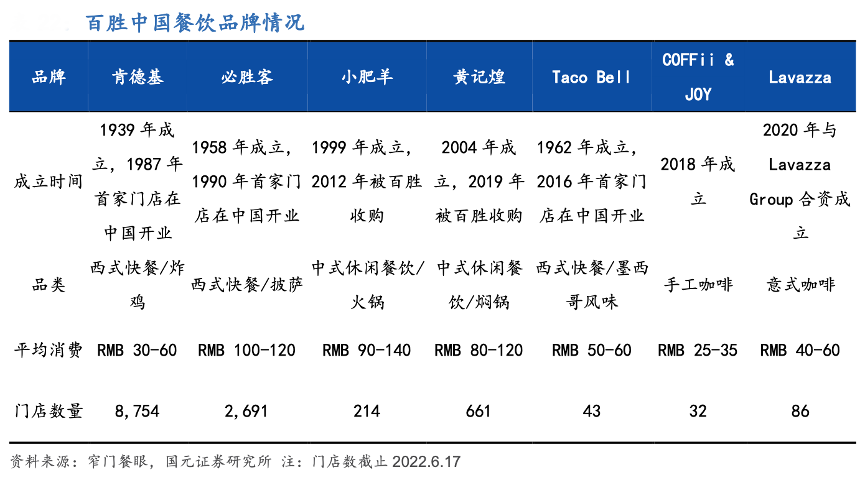 經典案例:根據窄門餐眼、國元證券研究所等綜合資訊表明,百勝中國是國內西式連鎖快餐龍頭,全國門店數超12000 家。目前其旗下餐廳網絡包括旗艦品牌肯德基和必 勝客,以及小肥羊、黃記煌、COFFii & JOY、塔可貝爾及 Lavazza 等新興品牌,形成涵蓋西式快餐、中餐以及咖啡等多品類的品牌矩陣。截止 2022 年 3 月 31 日根據公司財報披露,百勝中國在國內的門店數量共計 12117 家,覆蓋全國超過 1700 家城市。