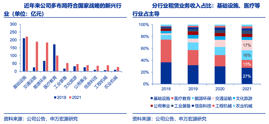 經典案例:根據公司公告、申萬宏源研究等綜合資訊表明,隨著廠商租賃業務模式不斷成熟,目前江蘇租賃公司業務已經從傳統的醫療、基礎設施、教育、印刷等 領域滲透到適合廠商租賃和直租業務的新能源、高端設備等新興行業,形成了覆蓋十大板塊 50 多個細分市場的格局,形成了 2 個百億級、2 個五十億級、多個二十億級及若干億級市場的多層次業務結構。