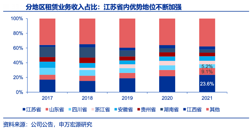 經典案例:根據公司公告、申萬宏源研究等綜合資訊表明,江蘇租賃公司立足江蘇省、鞏固公司在省內的核心優勢,并將業務積極向融資租賃需求較大的地區拓展,近年來江蘇省租賃業務收入比例不斷上升,從 2018 年的15.3%升至2021年的23.6%,其余地區業務分布較為分散,主要集中在山東、四川、浙江、安徽等地。