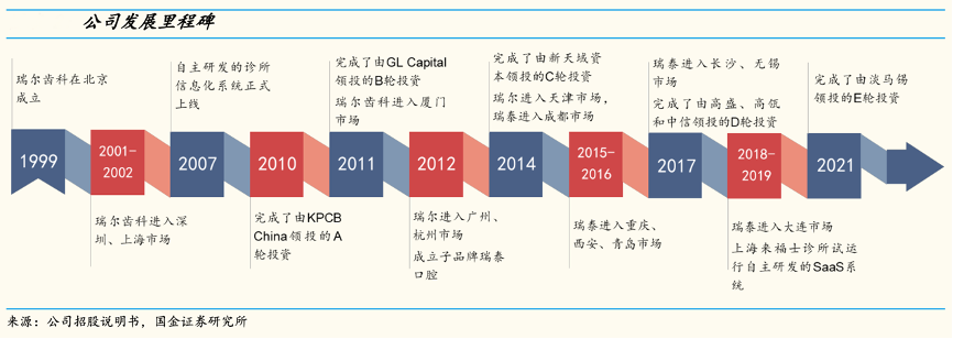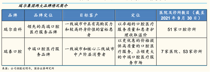 經(jīng)典案例:根據(jù)公司招股說明書、國金證券研究所等綜合資訊表明,瑞爾集團成立于 1999 年,是中國最大的高端民營口腔醫(yī)療服務(wù)提供商,公司業(yè)務(wù)遍布全國,同時運營瑞爾齒科(領(lǐng)先的高端品牌)和瑞泰口腔 (快速成長的大眾品牌之一)。