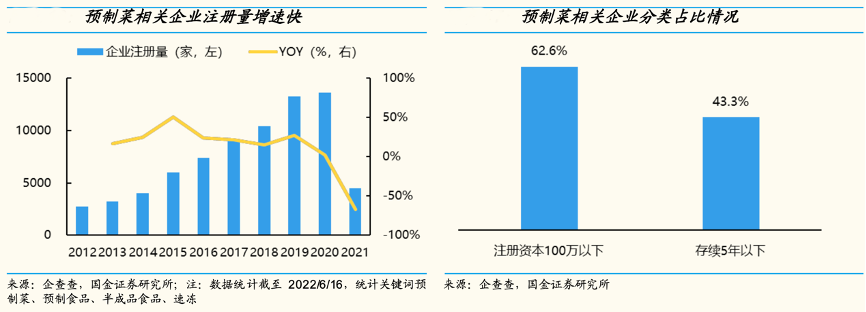 經(jīng)典案例:根據(jù)企查查、國金證券研究所等綜合資訊表明,近幾年預(yù)制菜相關(guān)企業(yè)注冊量增速高達(dá) 20% 以上,以中小規(guī)模企業(yè)為主,注冊資本 100 萬以下、存續(xù)五年以上的預(yù)制菜相關(guān)企業(yè)占比達(dá) 62.6%、43.3%,不少仍是個(gè)體工商戶和作坊式的生產(chǎn)加工模式,仍舊處于藍(lán)海競爭局面。