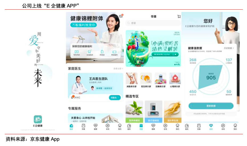 經(jīng)典案例:根據(jù)京東健康A(chǔ)PP、中信證券研究部等綜合資訊表明,京東健康上線企業(yè)數(shù)字化健康管理平臺,通過B2B2C 模式挖掘用戶與業(yè)務(wù)新增量。2021 年,公司上線企業(yè)數(shù)字化健康管理平臺“E 企健康 APP”,為企業(yè)員工提供全面的醫(yī)療健康服務(wù)和豐富的產(chǎn)品選擇。