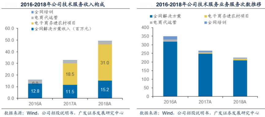 經(jīng)典案例:根據(jù)公司招股說(shuō)明書、廣發(fā)證券發(fā)展研究中心等綜合資訊表明,國(guó)聯(lián)股份的全網(wǎng)培訓(xùn)、電商代運(yùn)營(yíng)收入基本穩(wěn)定;電子商務(wù)進(jìn)農(nóng)村項(xiàng)目實(shí)施以來(lái),收入逐年上漲,2017年為1850萬(wàn)元,2018年增加67.57%達(dá)3100萬(wàn)元;全網(wǎng)解決方案收入波動(dòng),大致呈上漲趨勢(shì),2018年較2016年增加15.79%至 1520萬(wàn)元。各類技術(shù)服務(wù)次數(shù)除電子商務(wù)進(jìn)農(nóng)村項(xiàng)目外均減少,其中全網(wǎng)解決方案次數(shù)減少極為顯著,各類服務(wù)單價(jià)呈上升趨勢(shì)。