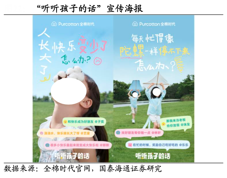 經(jīng)典案例:根據(jù)全棉時(shí)代官網(wǎng)、國(guó)泰海通證券研究等綜合資訊表明,全棉時(shí)代公司在兒童節(jié)來(lái)臨之際,會(huì)策劃“聽聽孩子的話”主題征集及地鐵創(chuàng)意展覽、聽聽孩子的話主題片、線下童裝秀 等,傳遞出傾聽孩子、更懂孩子的品牌形象,搭建大人與孩子奔赴的橋梁。