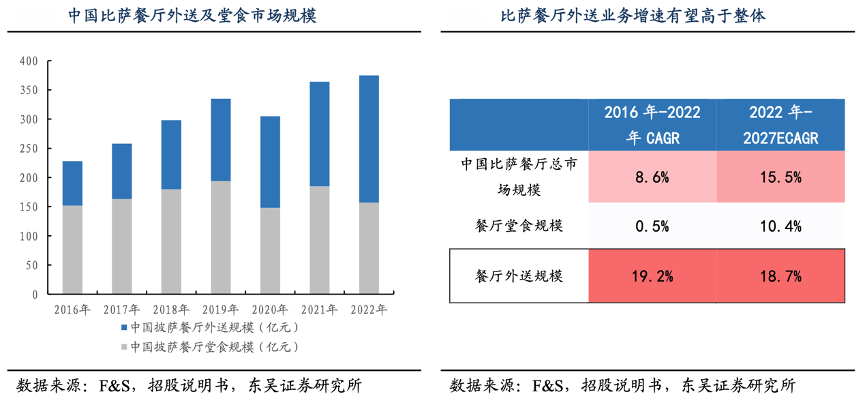 經(jīng)典案例:根據(jù)F&S、招股說明書、東吳證券研究所等綜合資訊表明,達美樂外送打造差異化,堅守“三十分鐘必達,遲到送免費比薩券”的承諾;根據(jù) F&S 數(shù)據(jù),2022 年中國比薩餐廳行業(yè)中,外送規(guī)模已達 218 億元,占比高達 58%。