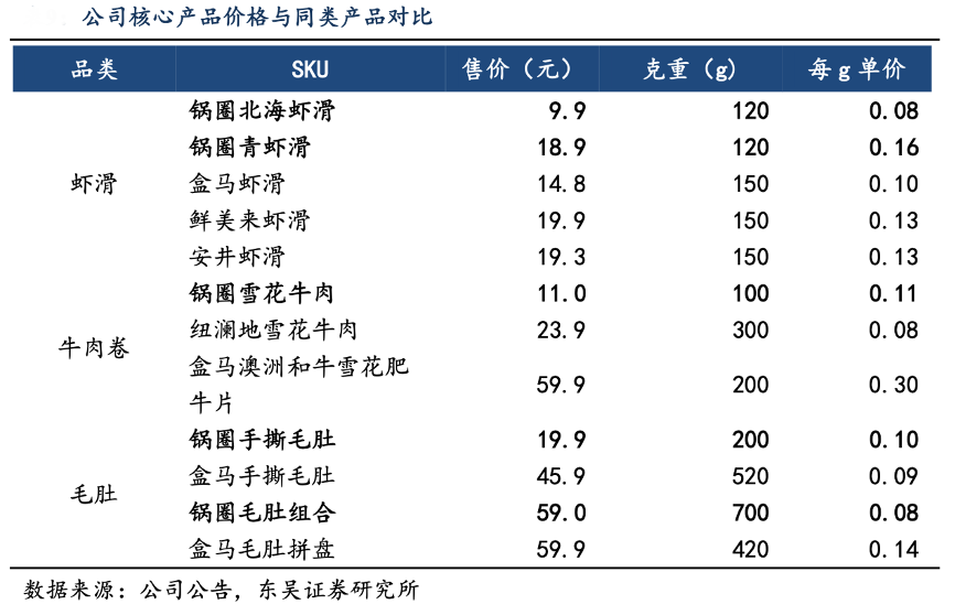 經典案例:根據公司公告、東吳證券研究所等綜合資訊表明,以蝦滑為例,鍋圈公司在廣西北海投資建設的逮蝦記工廠,依托當地優質青蝦資源,再加上規模化集采將原料成本降低 30%。公司的基礎款蝦滑產品比盒馬自有品牌、鮮美來、安井的售價都更有性價比,拳頭產品毛肚組合也是極具價格優勢。